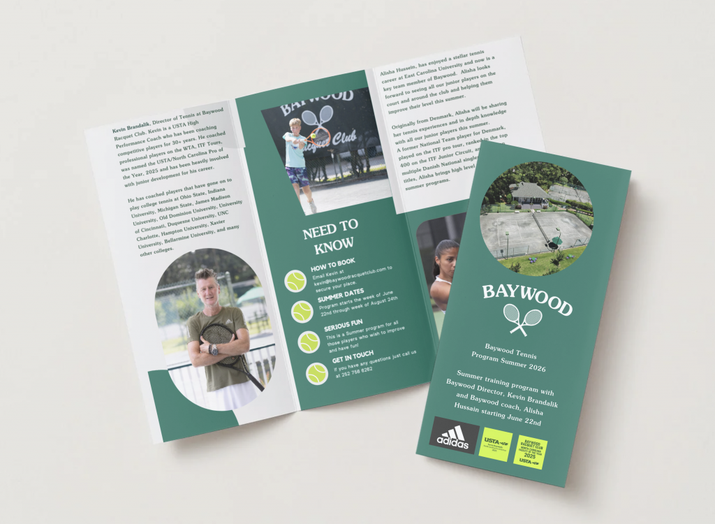 The Baywood tennis program is led by Director of Tennis, Kevin Brandalik (2025 North Carolina Pro of the Year) and caters to all levels and ages, so you will be sure to find your feet in no time. Our USTA junior program ensures that young players can enjoy tennis and start their journey of a “sport for life.” The adult program offers expertise for all levels of players and can help you come back to tennis, brush up your skills or enhance your skill level for that crucial league match.